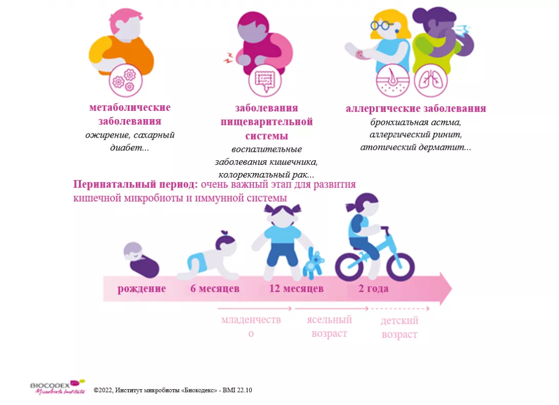 Антибиотик-ассоциированная диарея — не единственный побочный эффект. Дисбиоз, особенно развившийся в очень раннем периоде жизни, вероятно, отвечает за долгосрочные последствия. Предполагается, что в перинатальном периоде, когда происходят наиболее важные процессы развития и созревания микробиоты и иммунной системы 7, нарушение микробиоты кишечника, связанное с применением антибиотиков, повышает риск возникновения ряда хронических заболеваний (ожирение, сахарный диабет, бронхиальная астма, хронические воспалительные заболевания кишечника) 8.