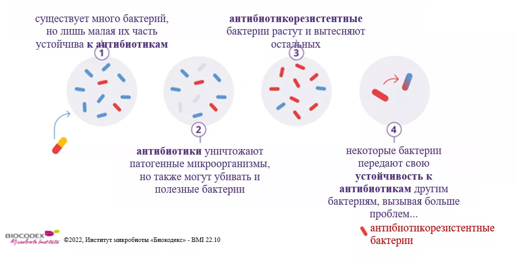 Однако, хотя антибиотики убивают патогенные бактерии, вызывающие инфекции, они могут уничтожать и некоторые полезные бактерии в нашей микробиоте, вызывая дисбаланс в этой сложной экосистеме — дисбактериоз. 3