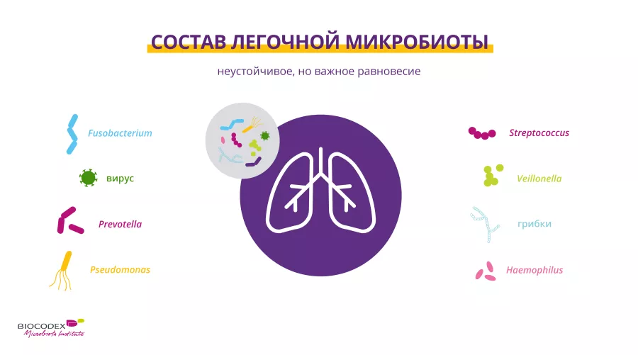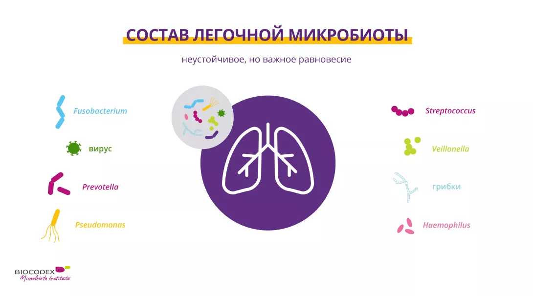 Снизить разнообразие бактерий и привести к дисбалансу в микробиоте дыхательных путей способно множество факторов: некоторые из них связаны с нашим организмом (пониженная иммунная защита, кашель и т. д.), другие относятся к окружающей среде (курение табака, вирусные инфекции, лечение антибиотиками и т. д.). Дисбаланс (дисбактериоз) в легочной микробиоте может вызывать появление патогенных бактерий или грибов и способствовать развитию хронических респираторных заболеваний, таких как астма или хроническая обструктивная болезнь легких (ХОБЛ).