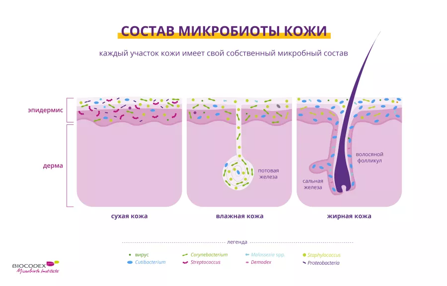 Несмотря на это, кожа имеет собственную уникальную микробиоту, в состав которой входят бактерии (Cutibacterium acnes, Staphylococcus epidermidis и др.), грибы (например, Malassezia), вирусы (например, папилломавирус) и паразиты (включая клещей, таких как Demodex). Эти микроорганизмы живут в идеальной гармонии и вместе образуют микробиоту кожи.1,5