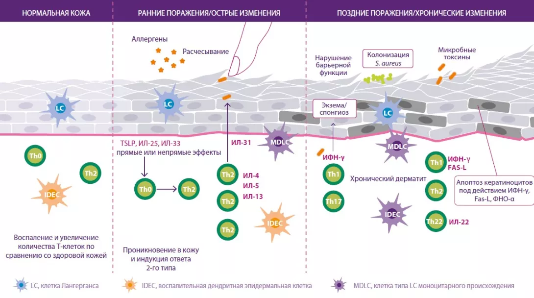 На патофизиологическом уровне АД характеризуется нарушением кожного барьера, дисбиозом кожи и кишечника и иммунной дисрегуляцией с активацией лимфоцитов Th2. Последняя приводит к значительному всплеску уровня цитокинов, что, в свою очередь, вызывает воспалительные реакции2.