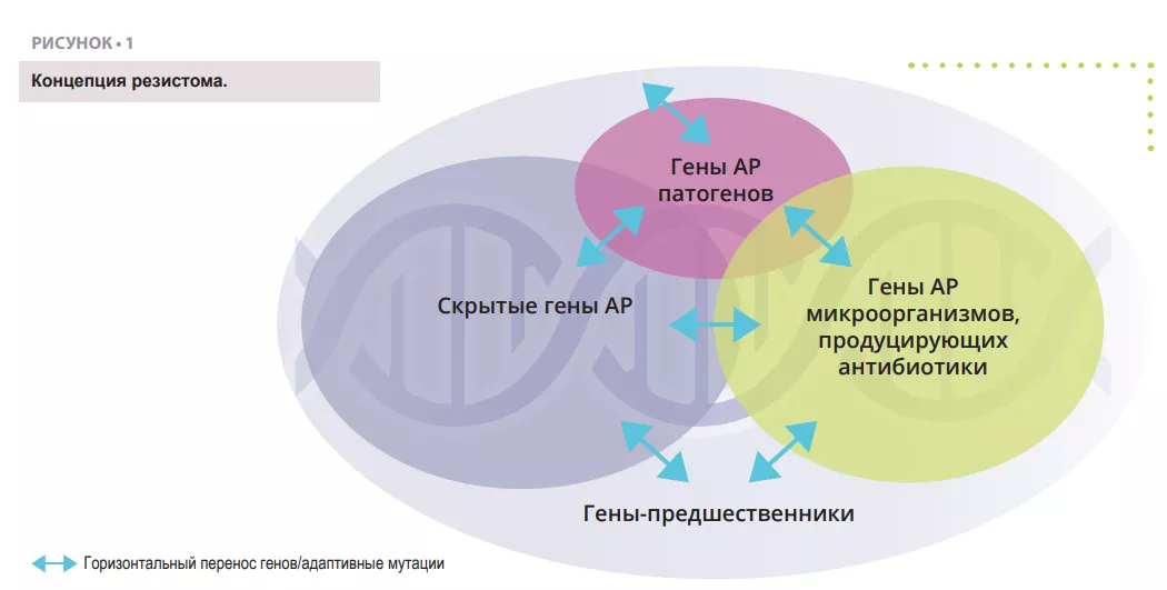 Резистомом называют весь набор генов, кодирующих связанные с АР белки, или белки, потенциально способные эволюционировать в мощные инструменты АР [4] (рисунок 1). Он включает известные гены АР у патогенных (проблемные) и антибиотикпродуцирующих организмов (например, Streptomyces spp. , производящий стрептомицин), ассоциированные гены резистентности [5], скрытые гены АР (т. е. гены, способные обеспечить резистентность в определенных условиях, например, эффлюксные насосы или порины), предшественники генов АР, кодирующие белки с минимальным уровнем аффинности или резистентности к антибиотическим соединениям.