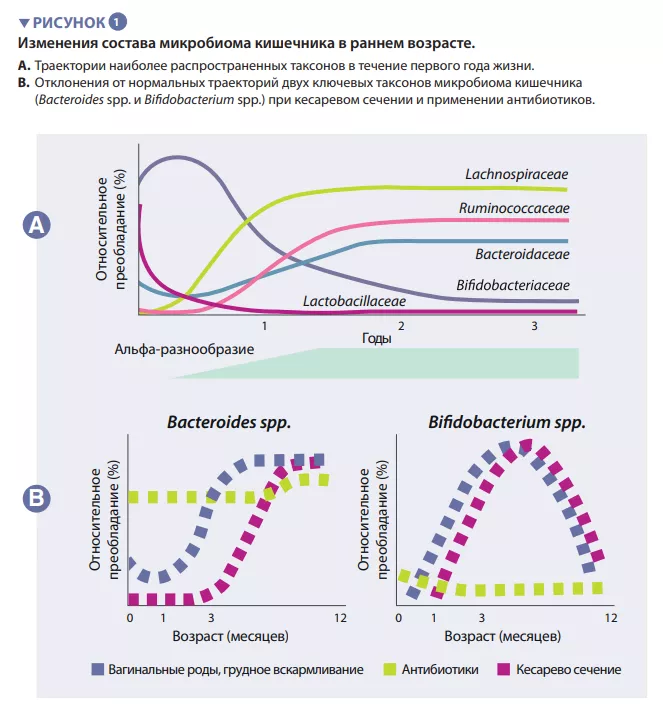 Первые виды-колонизаторы могут влиять в долгосрочной перспективе на траектории развития микробиома кишечника у детей. Этот экологический процесс определяет фундаментальную роль в формировании сообщества раннего контакта с новой экосистемой. Он объясняет влияние способа рождения на исходный состав микробиома ребенка. Большие когортные исследования в ыявили различия в микробиоме, связанные с кесаревым сечением, которые сохранялись в течение нескольких месяцев после рождения, вероятно, влияя на этот критический период развития организма [5]. К ним относятся меньшее содержание Bacteroides и Bifidobacterium spp., а также большее количество условно-патогенных видов.