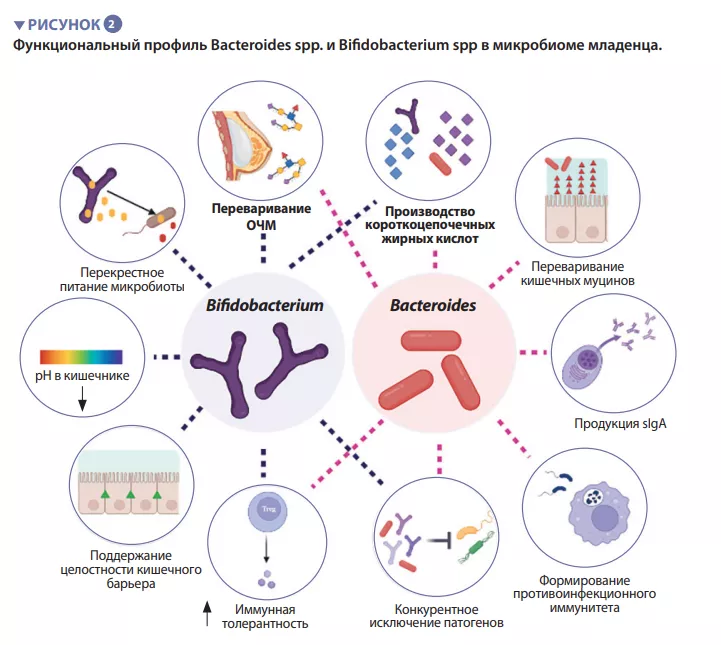 В кишечнике младенца происходят важные метаболические процессы, связанные сищеварением, энергетическим обменом и формированием иммунитета. Перерабатывая компоненты грудного молока, виды Bifidobacterium снижают рН в кишечнике за счет производства молочной (лактат) и уксусной (ацетат) кислот, значительно облегчая всасывание питательных веществ в кишечнике. Ацетат необходим для образования большинства короткоцепочечных жирных кислот (КЦЖК) в кишечнике ребенка и защиты от энтеропатогеных микроорганизмов [2]. Бифидобактерии также участвуют в процессе перекрестного кормления, в котором производимые ацетат и лактат служат субстратами для роста других видов, таких как Roseburia, Eubacterium, Faecalibacterium и Anaeroestipes , способствуя поддержанию разнообразия микробиома. Виды Bacteroides могут ферментировать грудное молоко, это важные продуценты КЦЖК пропионата. Они обладают уникальной способностью метаболизировать олигосахариды, полученные из муцина [3]. Метаболическая пластичность улучшает способность переносить изменения кишечной среды между приемами пищи, а также после прекращения грудного вскармливания и введения в рацион твердой пищи. Виды Bacteroides необходимы для созревания иммунной системы, являясь важным источником микробного липополисахарида, они стимулируют процессы развития иммунной толерантности в кишечнике [4]. Учитывая их особую приспособляемость к среде кишечника младенца, передачу от матери к ребенку, доминирование в кишечнике младенца, важность для других компонентов микробной экосистемы и пользу для организма, представители Bacteroides spp. и Bifidobacterium spp. представляют собой ключевые составляющие детского микробиома (рисунок 2).