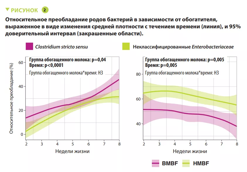 Более высокие объемы потребления ПЧГМ положительно коррелировали с бактериальным разнообразием и плотностью в группе BMBF, но не в группе HMBF. Объемы потребления BMBF положительно коррелировали с относительным и стандартизированным преобладанием Firmicutes и Clostridium stricto sensu, а объемы потребления HMBF положительно коррелировали с относительным и стандартизированным преобладанием Clostridium stricto sensu и отрицательно — со Staphylococcus.