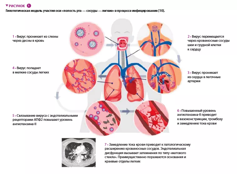 Эта в значительной степени гипотетическая связь основана на ряде факторов, которые имеют общую значимость в патофизиологии инфекции SARS-CoV-2 и периодонтита. Во-первых, легочные рентгенологические признаки первично сосудистого повреждения предполагают существование оси «полость рта — сосуды — легкие», образующей прямой путь распространения инфекции в дополнение к непосредственной доставке патогенов в легочные сосуды с током крови (рисунок 1) [10]. Во-вторых, данные метагеномного анализа показали, что верхние дыхательные пути, главный анатомический о ч а г п е р в и ч н о й и н ф е к ц и и , с о д е р ж а т многие виды бактерий, вовлеченные в развитие заболеваний полости рта, которая может служить естественным вирусным резервуаром. В-третьих, выживание вирусов в десневой биопленке и их способность к транслокации из слюны в зубодесневой карман способствуют избеганию иммунного ответа. В - ч е т в е р т ы х , э т о о б и л и е р е ц е п т о р о в ангиотензинпревращающего фермента 2 на ключевых компонентах оси «полость рта — сосуды — легкие».