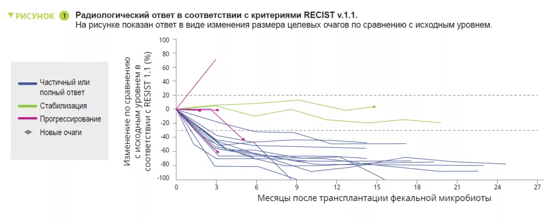 Почти у половины пациентов с распространенной меланомой, получающих монотерапию анти-PD-1, развивается первичная резистентность, что подчеркивает необходимость разработки новых стратегий лечения для улучшения ответа на ингибиторы контрольных точек иммунного ответа (ИКТ). Хотя комбинация анти-PD-1 и анти-CTLA4 (антиген-4, ассоциированный с цитотоксическими Т-лимфоцитами) увеличивает частоту ответа, возможности этой терапии ограничены большим количеством иммуноопосредованных нежелательных явлений(иоНЯ). Кишечный микробиом, как оказалось, является важным регулятором местных и системных иммунных реакций. Результаты нескольких исследований у онкологических пациентов, получавших ИКТ, показали связь между определенными кишечными бактериями и иммунным ответом, а также побочными эффектами [1]. Если точнее, присутствие некоторых комменсальных родов, таких как Ruminococcus, Faecalibacterium и Eubacterium, было связано с положительными результатами у пациентов с меланомой [2]. Терапевтический потенциал кишечного микробиома был впервые показан на мышиных моделях, где комбинация ИКТ + ТФМ с использованием фекалий пациентов, не ответивших на лечение (NR), ассоциировалась с резистентностью к ИКТ [1]. Два исследования показали, что ТФМ у пациентов с долгосрочным ответом на терапию ИКТ позволяла преодолеть резистентность к анти-PD-1 почти у 30% пациентов с меланомой, резистентной к ИКТ [3, 4]. В этих исследованиях микробиота пациентов изменилась после ТФМ, при этом у пациентов с ответом (R) наблюдалось увеличение содержания Ruminococcaceae и Bifidobacteriaceae, наряду с перепрограммированием микроокружения опухоли в виде увеличения инфильтрации CD8+ Т-клетками и активации сигнального пути интерферона-γ. Эти данные доказывают потенциальную эффективность вмешательств на уровне микробиома для преодоления резистентности к ИКТ при меланоме.