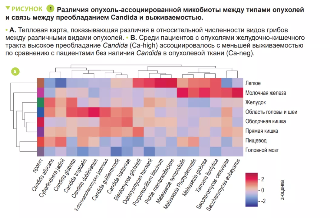 и транскрипционную активность некоторых видов Candida в опухолевой ткани. Наконец, содержание некоторых грибов в опухолевой ткани позволяло предсказать уровень экспрессии опухолевых генов, статус заболевания и выживаемость (рисунок 1B), однако эти результаты все еще нуждаются в подтверждении. В целом, полученные данные свидетельствуют об участии грибов, особенно Candida, в патогенезе злокачественных новообразований желудочно-кишечного тракта, но также подчеркивают их потенциал в качестве терапевтической мишени и прогностического инструмента.