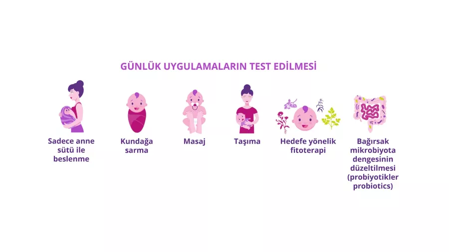 Aile doktoru bebeklerde koliği tanımlamak ve ebeveynlere güven vermek için hala başvurulacak ilk adrestir.Koliğin tedavisi yoktur10 ancak her gün yapılacak birkaç basit uygulama semptomları rahatlatmaya yardımcı olabilir.Bunlar arasında emzirmek, bebeğinizi taşımak ve özellikle probiyotikler kullanarak bebeğinizin bağırsak mikrobiyotasını dengelemek yer alır.5 Birkaç ay boyunca "iyi" bakterilerin alınması bağırsak enflamasyonunu azaltabileceği 6 ve ağlamanın süresini azaltmaya yardımcı olabileceği için probiyotikler umut vaat eden bir yol gibi görünmektedir.11 İyi bir bağırsak dengesini korumaya yardımcı olduğu için probiyotikler önleyici bir tedbir olarak da kullanılabilir.5