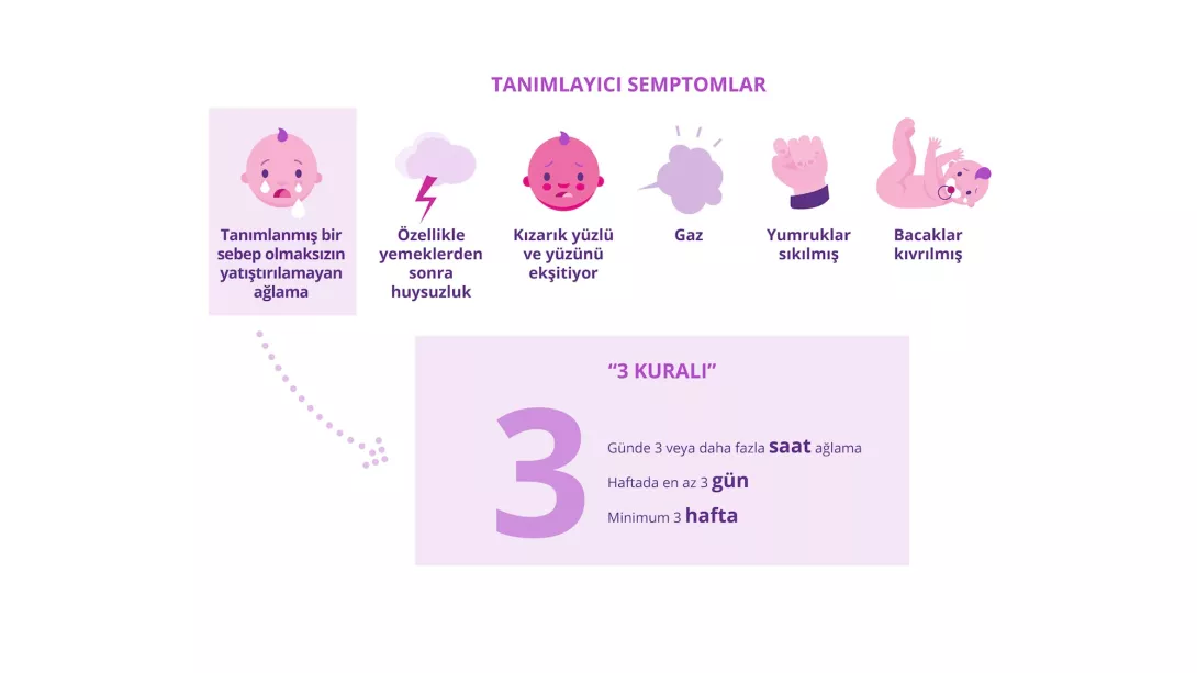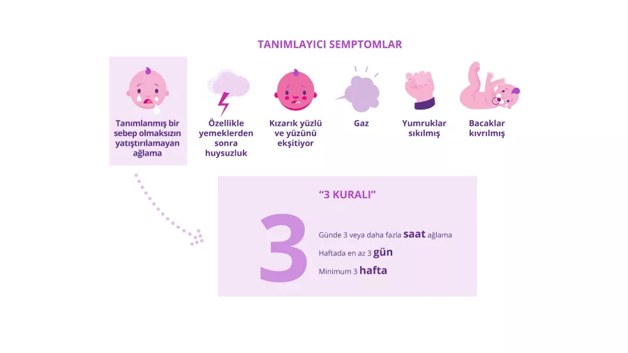 Bebek çok ağlamaktadır, sakinleştirilemez, yüzünü buruşturur ve yüzü kırmızı olabilir. Yumruklarını sıkar ve gazı olabilir.5 Çocuk doktorları bebeklerde kolik tanısını koymak için uzun süredir "üç kuralını" kullanmaktadır.6 1954 yılında kullanılmaya başlayan bu kriterler aşağıdaki kriterler ile yeni bir tanım vermek üzere sonrasında uluslararası bir örgüt tarafından adapte edilmiştir: tekrar eden ve uzun süreli huzursuzluk dönemleri, büyüme geriliği, ateş veya kötü sağlık gibi bariz bir nedeni olmayan ve bebeğe bakan kişiler tarafından önlenemeyen ve çözülemeye ağlama ve sinirlilik durumu.7