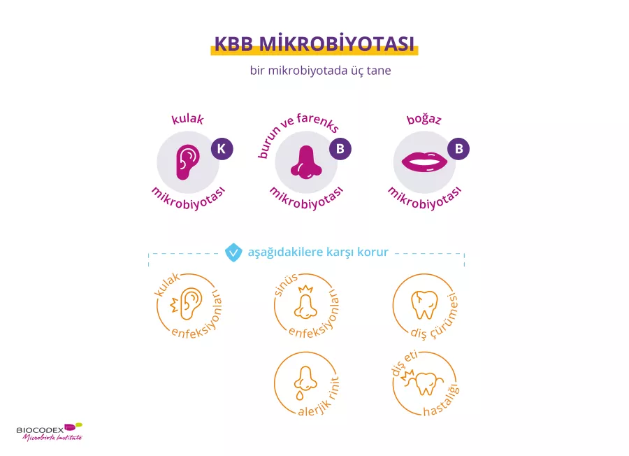 KBB (kulak, burun, boğaz) mikrobiyotası üç farklı bakteri florasından oluşur: ağız mikrobiyotası, kulak (oriküler) mikrobiyotası ve nazofaringeal mikrobiyota.