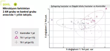 GM bileşimi, akut malnütrisyon evresinde başvuru sırasında önemli ölçüde farklılık göstermiş, alfa çeşitliliği açısından bir fark görülmemiştir (Şekil 1). AN hastalarında kontrollere kıyasla gözlenen GM farklılıkları, anlamlı olmasa bile, çalışma boyunca devam etmiştir. Bir yıl içinde VKİ<15th p olan adölesanlarda, alfa çeşitliliği (Chao1 indeksi) hastaneye yatış sırasında, taburcu olurken ve 1 yıllık takipte anlamlı derecede azalmıştır. Benzer bir eğilim, kontrollere kıyasla VKİ≥15 olan AN hastalarında da gözlenmiştir. Başvuru sırasında, PERMANOVA analizi Legionella, Dialister, Ruminococcaceae UCG-003 ve Limnobacter cinslerinde kontrollere kıyasla anlamlı bir azalma olduğunu göstermiştir. Hastane içi tedavi sırasında, AN hastaları ve kontroller arasındaki farklar azalmış ve sadece amplikon dizileri varyantlarında (ASV'ler) kalmıştır. Bir yıl sonra, BMI <15th p olan AN hastaları ile kontroller arasında filum, sınıf ve takımlar açısından hala önemli farklılıklar gözlenirken (p = 0,001 ila <0,001), BMI≥15th p olan AN hastaları ile kontroller arasında da Anoreksiya nervozalı ergen hastalarda bağırsak mikrobiyomunun uzunlam küçük farklılıklar gözlenmiştir (ASV'ler açısından p = 0,063) (şekil 2).