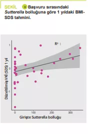 Başvuru sırasındaki GM analizi, hastalık süresi (filum-aile düzeyi, p = 0,011 ila 0,022) ve kilo kaybı miktarı (sınıf-genera düzeyi, p = 0,030 ila 0,047) arasında anlamlı bir ilişki olduğunu ortaya koymuştur. Laksatif kullanımı için düzeltme yapılan boylamsal bir PERMANOVA analizi, GM ile alınan kalori miktarı (p = 0.003, R2 = 0.009), BMI-SDS (p= 0.006, R2 = 0.008) ve leptin konsantrasyonu-başlangıçta, taburcu, ve 1-yıl takibi (p = 0.02, R2 = 0.02). Ruminiclostridium 5 (p=0.006) ve Intestinibacter (p=0.03) generaları hastaneye tekrar yatış riski ile ilişkilendirilmiştir. Laksatif kullanımı, hastalık süresi, kilo kaybı ve başvuru sırasındaki BMI-SMS için düzeltme yapılan doğrusal model analizi, başvuru sırasında dört cinsin 1 yıllık takipte BMI-SDS ile ilişkili olduğunu belirlemiştir: Sut- terella, Parasutturella, Lachnospiraceae FCS020 grubu ve Clostridium stricto sensu (p = 0,008 ila 0,04) (şekil 3).