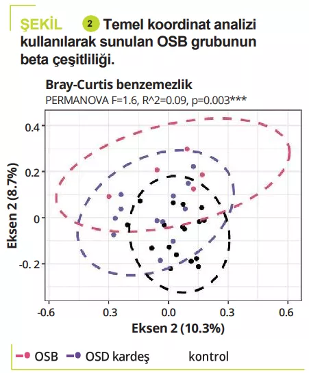 32 DEHB, 12 OSB, 11 DEHB/ASD, 14, 5, 4 kardeş ve 17 akraba olmayan kontrol olmak üzere 5-17 yaş arası top-lam 95 çocuk. Gastrointestinal bozukluk-lar kabızlık şeklindeydi: DEHB %15,6 (kardeşler %7,1), OSB %8,3 (kardeşler %0), DEHB/ASD %18,2 (kardeşler %0), kontroller %5,9; karın ağrısı: DEHB %3,1 (kardeşler %0), OSB %16,7 (kardeşler %0), DEHB/ASD %18,2 (kardeşler %0), kontroller %0; ve daha az sıklıkla gastro-özofageal reflü. Atipik diyetin en yaygın olarak OSB'li çocuklar arasında (%50) görüldüğü, esasen gıda alımında çeşitlilik olmadığı tespit edilmiştir. Bağırsak mikrobiyotasının analizi DEHB, OSB, DEHB/ASD ve akraba olan ya da olmayan kontroller arasında alfa çeşitli-liğinde herhangi bir farklılık bulamamıştır; aksine, OSB'li kardeşlerde alfa çeşitliliği önemli ölçüde düşüktür (şekil 1). Bağır-sak mikrobiyota bileşimi, beta çeşitliliği-nin gösterdiği gibi DEHB ve OSB arasın-da çok benzerdi, ancak bu, akraba olma-yan kontrollere kıyasla DEHB ve OSB a-rasında önemli ölçüde farklılık vardı (şekil 2). Bağırsak mikrobiyota bileşimi-nin analizi, bazı DEHB, OSB veya DEHB /ASD'li çocukların Bacteroidetes filumun-da nispeten daha düşük bir miktar ve Ac-tinetobacteria'da daha fazla miktarda ol-duğunu göstermiştir. Tüm gruplarda Bac-teroides, Faecalibacterium, Blautia ve Bifidobacterium cinsleri baskındır; bazı çocuklar yüksek düzeyde Prevotella sergi-lemiştir. Bakteri cinslerinin bolluğundaki farklılıklar DEHB, OSB ve kontroller arasın-da bulunmuştur (şekil 3). ancak DEHB ve OSB arasında bulunmamıştır.