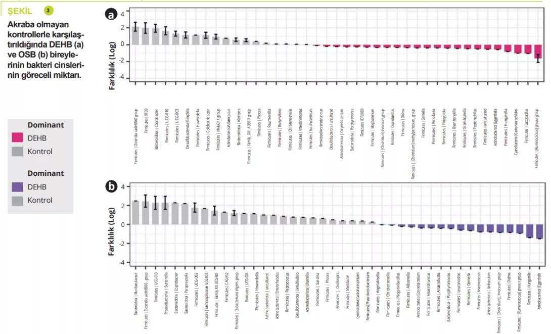 DEHB ve OSB'li çocuklar ve ergen-ler benzer bir bağırsak mikrobiyo-tasına sahiptir, ancak bu mikrobi-yota akraba olmayan kontrollerden farklıdır. Dahası, bağırsak mikrobi-yotasının beta çeşitliliğindeki var-yasyonlar, LBP'deki artışta olduğu gibi, sistemik pro ve anti-enflama-tuar moleküller arasındaki farklılık-larla ilişkilendirilmiştir.
