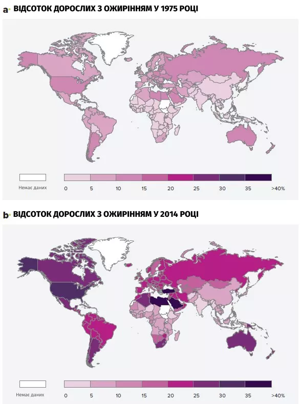 З роками зростає кількість дорослих із ожирінням. Поширеність ожиріння серед дорослих у країнах в 1975 році (a) та у 2014 році (b). Кількість дорослих із ожирінням значно зросла між 1975 і 2014 роками. База даних Глобальної обсерваторії охорони здоров’я (GHO).