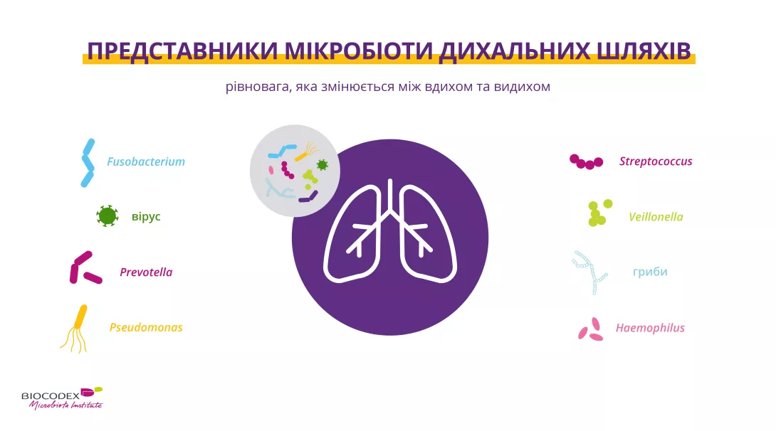 - Високий рівень біорізноманіття. У легенях здорових осіб переважають бактерії з родів Prevotella, Veillonella, Streptococcus, Neisseria, Fusobacterium and Haemophilus.5 Підтримання балансу цих бактерій залежить від ритму вдиху та видиху.6