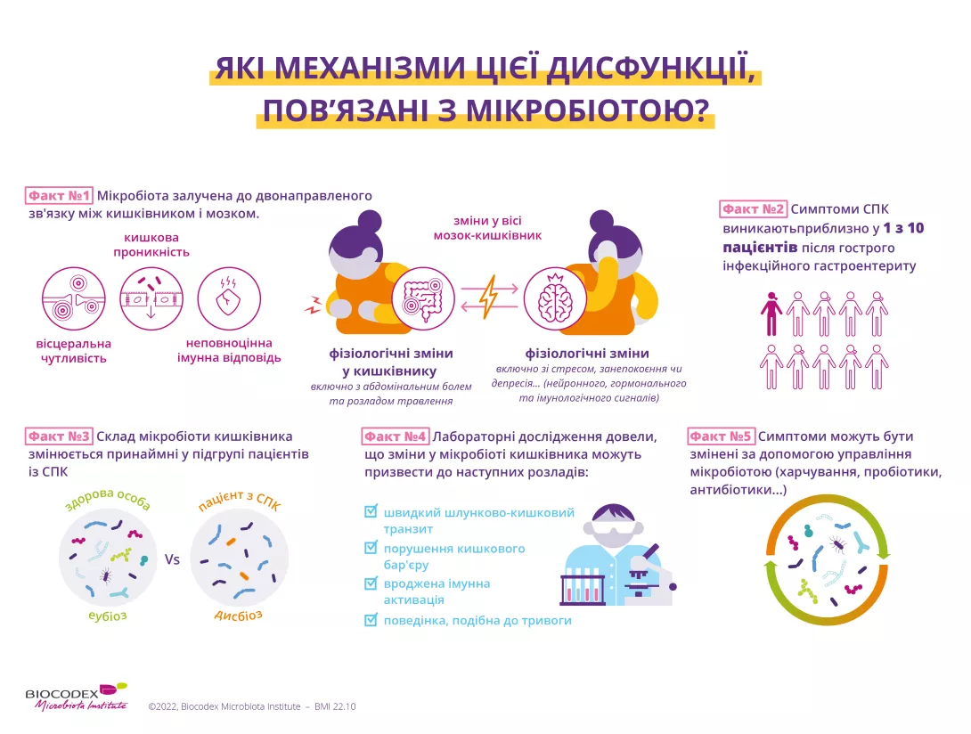 Синдром подразненого кишечника (СПК), який раніше називали «функціональним розладом кишечника», є найбільш поширеним порушенням взаємодії кишечника і мозку. Симптоми включають періодичні болі в животі, здуття живота і дисфункцію кишечника. Його основні симптоми стосуються кишечника, але СПК часто також може бути пов’язаний із тривогою та депресією. Сьогодні відомо, що порушення комунікації вздовж вісі кишечник-мозок, у яких бере участь кишкова мікробіота, відіграють роль у цьому синдромі.