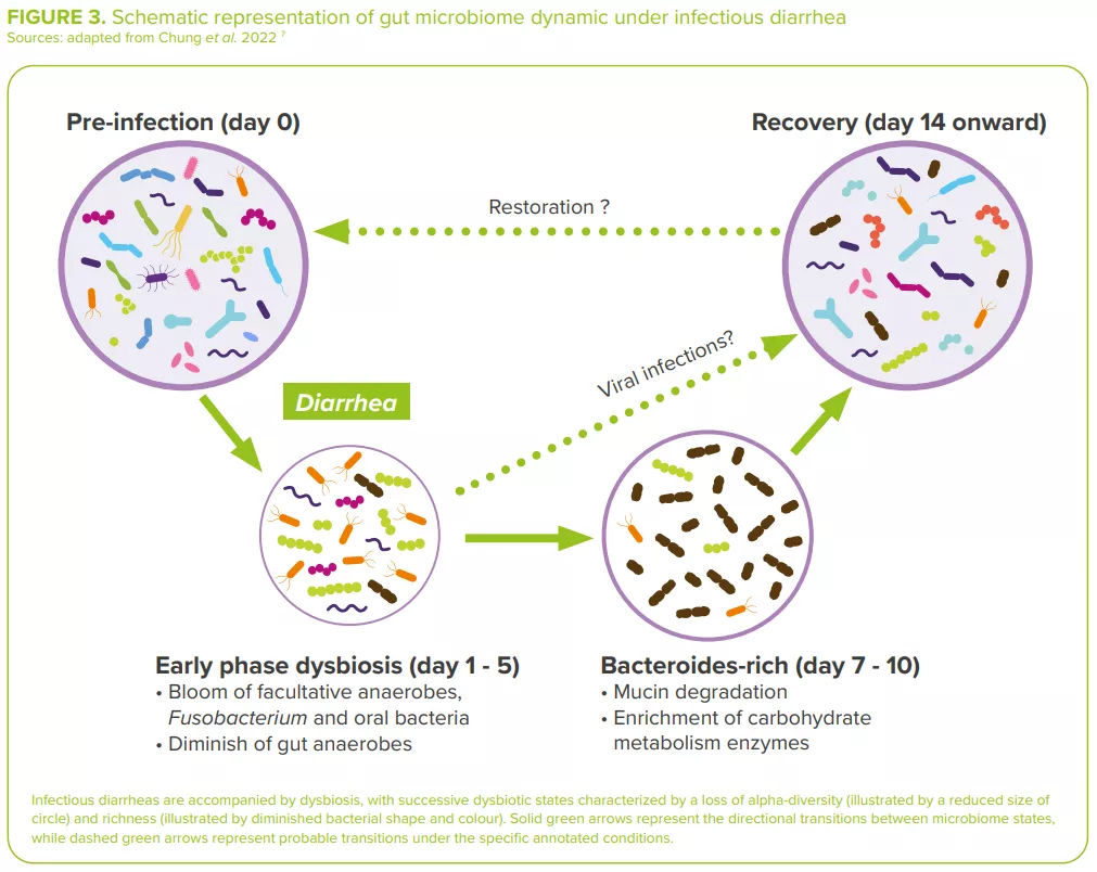 Bacterial diarrheas are accompanied by dysbiosis, usually with an overabundance of facultative anaerobes (Escherichia, Streptococcus, Enterococcus, etc.) in dysenteric diarrhea, and a depletion in bacteria of known immuno-modulatory effects (Lactobacillus ruminis, Bifidobacterium pseudocatenulatum)7 (Figure 3).