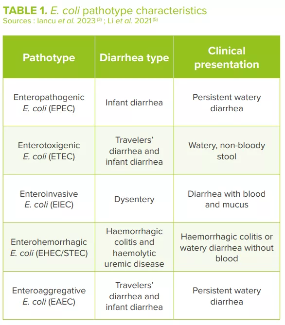 Pathogenic variants of Vibrio cholerae produce a cholera toxin that activates anion secretion, inhibits absorption of electroneutral NaCl and destroys the intestinal barrier function, thereby inducing massive fluid secretion in the lumen of the small intestine and the loss of large amounts of water, sodium, chloride, bicarbonate and potassium.3,5,13 Different pathogenic E. coli strains, classified into different pathotypes (Table 1), cause mild to severe diarrhea usually accompanied by fever. E. coli adheres to the intestinal epithelial cells through the adherent fimbriae, produces toxins and exerts its pathogenic effects.3,5