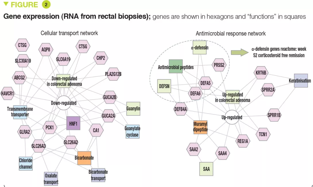 The clinical, biological, and endoscopic parameters that were associated with corticosteroid- free remission were validated in an independent prospective cohort of 307 children. It should be noted that corticosteroid- free remission was achieved by week 16 for moderate to severe disease (after which it can no longer be achieved) whereas it could be obtained up to week 52 in mild forms. Moreover, even patients with very severe disease were able to achieve week 52 corticosteroid-free remission (41/133 [31%] with PUCAI ≥ 65) and, conversely, some patients with mild disease were receiving anti-TNFα at week 52 (13/90 [14%] with PUCAI < 35). The authors identified 33 genes that were differently expressed between patients with moderate to severe disease who achieved corticosteroid-free remission (n = 51) or not (n = 101). Among these genes, 18 genes associated with cellular transport and ion channels were up-regulated and 15 genes involved in the antimicrobial response were down-regulated (Figure 2). The antimicrobial α-defensin signaling pathway showed the strongest negative correlation with week 52 corticosteroid-free remission. However, all 33 genes were negatively associated with the need for therapeutic escalation to anti-TNFα.