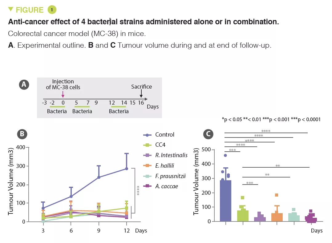 In several solid cancer models, including for CRC, lung and breast cancer, CC4 administration slowed down tumour growth. This benefit was primarily lymphocyte-mediated as it disappeared in mice without mature lymphocytes (Rag2 KO mice). The main candidates are interferon-gamma producing cytotoxic CD8+ T cells, which massively infiltrate the tumour in animals receiving CC4. The protective effect was also observed individually with each of the bacterial strains tested in a CRC model, but with varying degrees of efficacy (Figure 1). The therapeutic effect was unrelated to butyrate producing-bacteria.