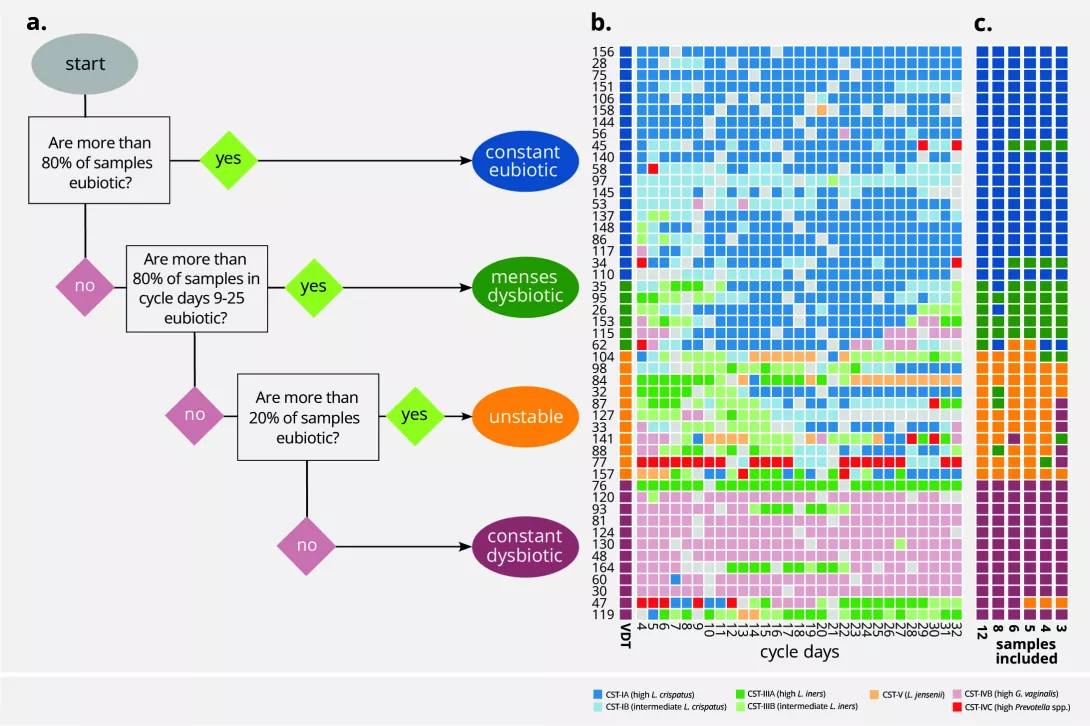 a. A decision tree can separate a time series of samples into dynamic groups, based on the community state types (CSTs). Input from the user determines which CSTs are considered eubiotic (here: I, II, and V) and which days are to be considered free from the influence of menses (here: cycle day 9 to cycle day 25). Time series with ≥80% eubiotic samples are considered constant eubiotic; conversely, those with >80% dysbiotic samples are considered constant dysbiotic. For those in the 20–80% range, a second assessment is done on the days free of menses: if they are >80% eubiotic, the time series is considered menses-related dysbiotic, and otherwise unstable (changing from eubiosis to dysbiosis without a clear temporal pattern). b. A colour map with one individual per row and one day per column. The colour of each intersection depicts CST. Coloured bars on the left side show the vaginal community dynamics of each woman. c. Additional colour bars show the inferred vaginal community dynamics of each participant when using fewer samples for classification. Reproduced from Hugerth LW, et al. Microbiome 2024, 12, 1531 (doi:10.1186/s40168- 024-01870-5) under a CC-BY 4.0 license (creativecommons.org/licenses/by/4.0). No changes have been made to the figure.
