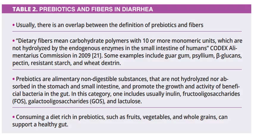 There is limited data regarding the prebiotics and fibers in treating diarrhea (table 2). Apparently, prebiotics are more prone to prevent and treat the recurrence of diarrhea. At the same time, fibers, mainly the viscous ones, are more indicated during acute episodes due to their water-retaining capacity. Other therapeutic options involve, in some cases, the probiotic administration and (table 3), in severe cases, the use of fecal microbiota transplantation (FMT).