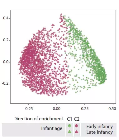 Late infancy GM had lower beta-diversity and intra-individual variability compared to early infancy GM (p < 0.001). Late infancy gut microbiota were enriched with Bacteroides, Faecalibacterium, Lachnospira, Prevotella, unclassified Lachnospiraceae and unclassified Clostridiales, but depleted with Clostridium, Veillonella, Bifidobacterium and unclassified Enterobacteriaceae. The principal component analysis identified two clusters (C1 and C2, Figure 1). C1 was composed of 75.5% of early infancy samples and C2 of 63.7% of late infancy samples. These early and late infancy samples representing vaginal births without intrapartum antibiotic prophylaxis were of type C2, dominated by the genus Bacteroides (Figure 2).