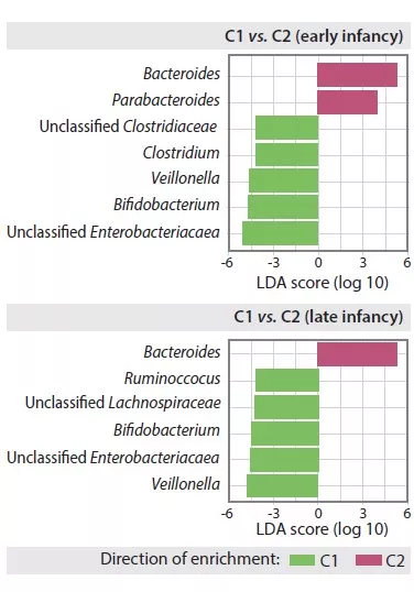 Composition of gut microbiota in early and late C1 and C2 clusters in infants.