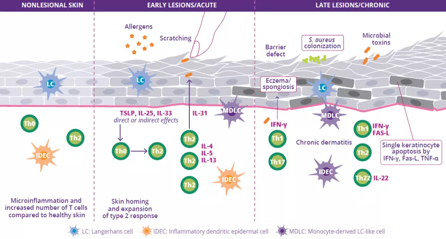 On a pathophysiological level, AD is characterized by an alteration of the skin barrier, a skin and gut dysbiosis, and immune dysregulation with the activation of Th2 lymphocytes. This immune dysregulation leads to a major cytokine surge, which in turn causes the inflammatory reactions.2