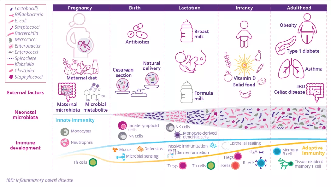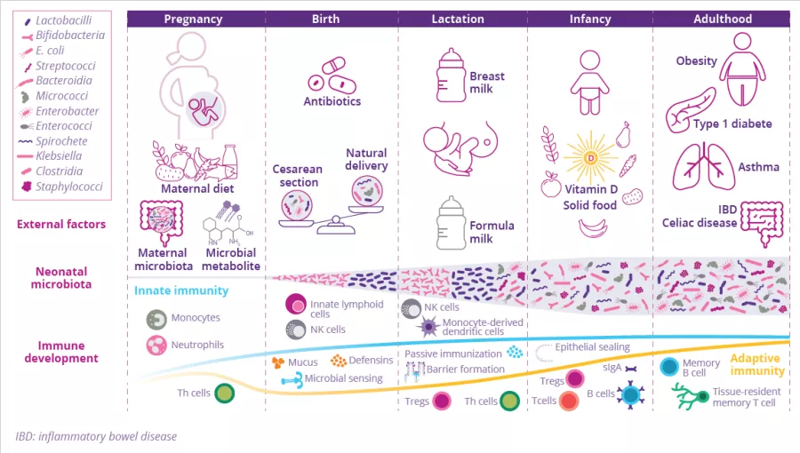 Throughout pregnancy, microbial metabolites (originating from the maternal microbiota and diet) influence fetal immune development. At birth, microbiota colonization starts in parallel with development of the immune system. At this stage, the newborn is still dependent on maternal protection, which is ensured through breastfeeding: maternal milk contains mother-derived bacterial antigens that stimulate the maturation of the innate mucosal immune system. Regarding gut microbiota colonization, Enterococcacae, Clostridiaceae, Lactobacillaceae, Bifidobacteriaceae, Streptococcaceae dominate in the first weeks of life. The introduction of solid food in an infant’s diet leads to an increase in gut microbiota diversity, evolving to a more adult-like microbiota: the abundance of Bifidobacteriaceae decreases, while Bacteroides, Ruminococcus, and Clostridium become more prevalent. Birth mode, breast milk, solid food, and the intake of antibiotics are factors that shape the early life microbiota and the neonatal immune system.