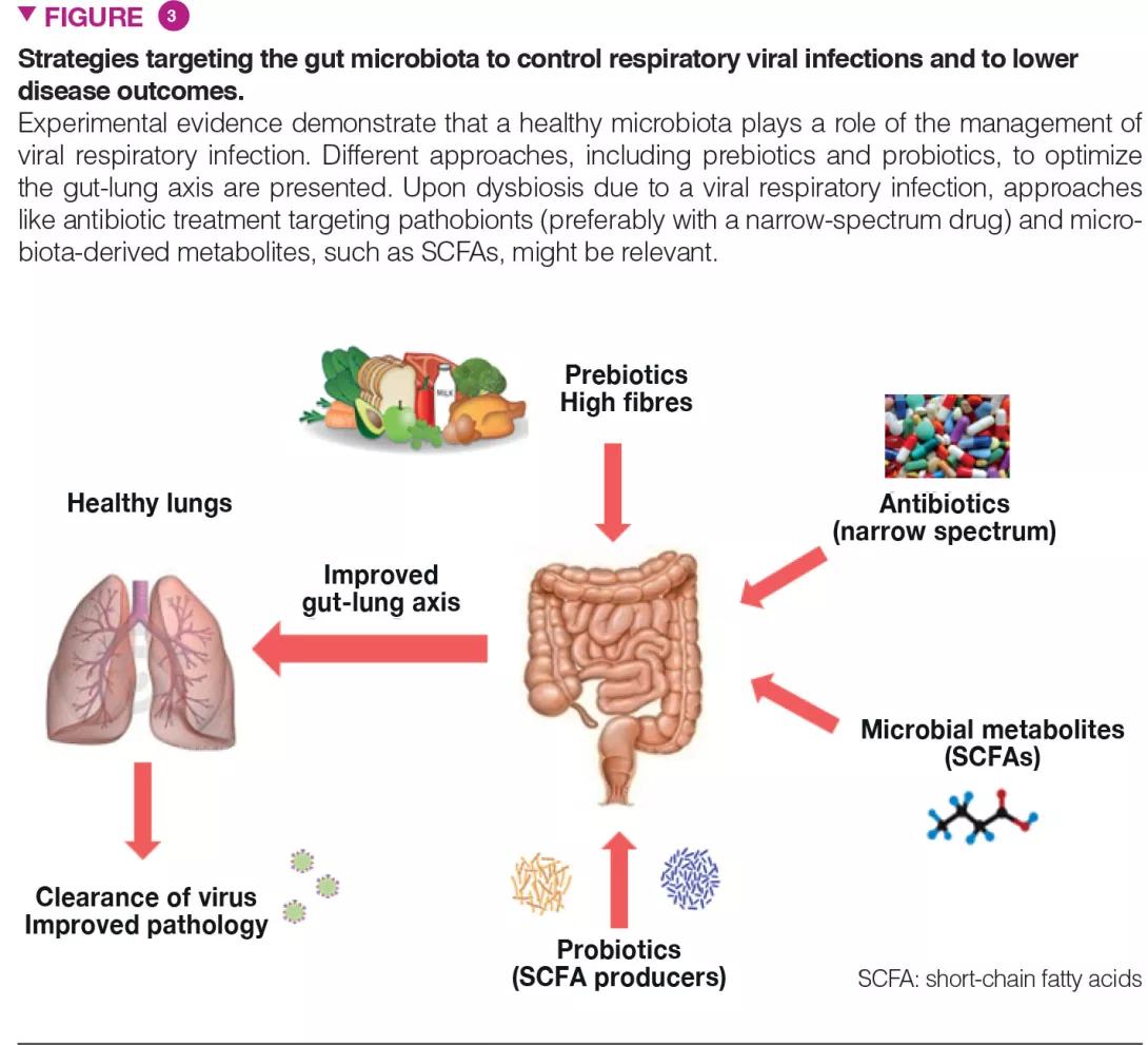 The gut-lung axis is important during viral respiratory tract infections. Alterations of the gut microbiota plays a part in secondary outcomes. The gut microbiota therefore represents a target to limit disease severity. Solutions for disease management include dietary ingredients (like prebiotic fibres) and probiotics.