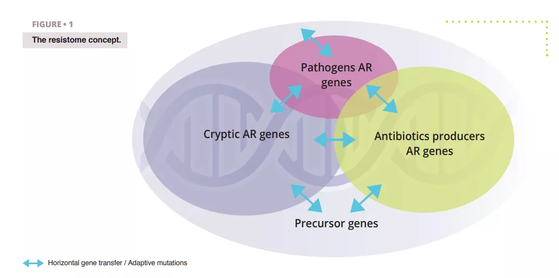 The resistome refers to the complete set of genes that encode for antibiotic resistance (AR)-related proteins or those proteins that could potentially evolve into powerful AR agents 4 (figure 1). This includes recognized AR genes in pathogenic bacteria (the problematic ones), AR genes from antibiotic-producing organisms, such as Streptomyces spp. producing streptomycin antibiotic and associated resistance gene[5], cryptic AR genes (i.e., genes that could provide resistance in a different genetic setting; e.g., upregulated efflux pumps or downregulated porins), and precursor AR genes that code proteins with a minimal level of affinity or resistance to antibiotic compounds.