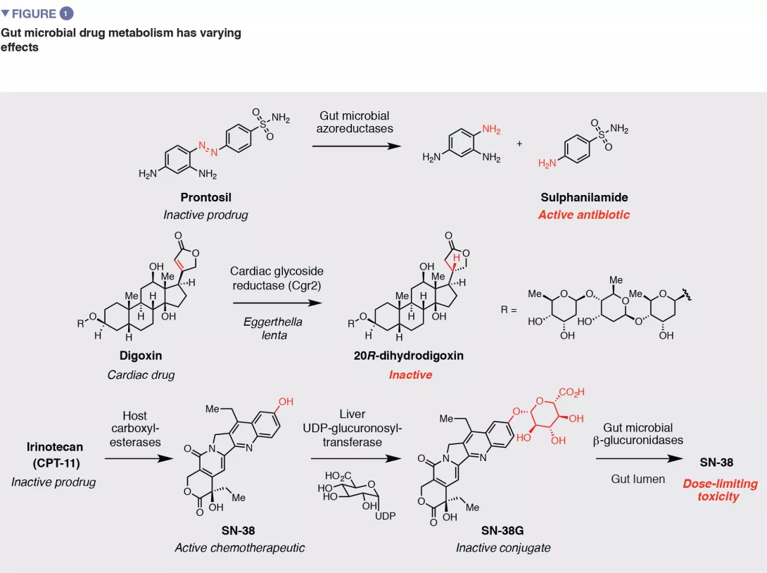 One prominent activity associated with the gut microbiota is the ability to chemically modify the structures of small molecule drugs. [1] Orally administered drugs encounter gut microbes either prior to absorption in the small intestine or in the large intestine if they are poorly orally bioavailable. Orally administered or injected drugs, or drug metabolites, also reach the microbiota if they undergo biliary excretion into the intestine. Because a drug’s pharmacological activity directly arises from its chemical structure, microbial metabolism can have a large effect on drug action.