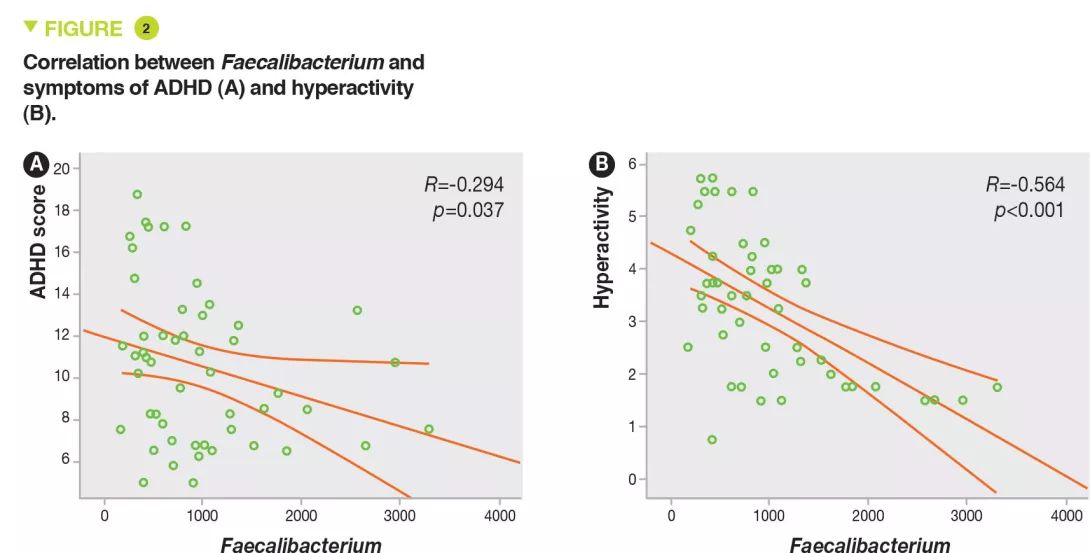 An operational taxonomical unit (OTU)-level analysis revealed a significant decrease in the fractional representation of Faecalibacterium in children with ADHD compared to HC. In individuals with ADHD, the abundance of Faecalibacterium was negatively associated with parental reports of ADHD symptoms. However, there was no significant difference in alpha diversity between the ADHD and control groups.