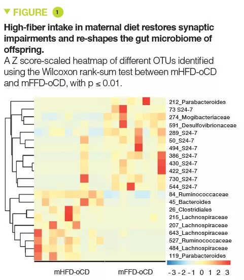 In mice, when the mothers received a mHFD for 12 weeks, memory and social interactions in the offspring were impaired compared with those of mothers fed a control diet (mCD) (p < 0.01). The use of 4 types of diet in the mothers, mCD, mHFD, mFFD (high-fat and high- fibre) and mFD (high-fibre), for 12 weeks, showed that a high-fibre diet in the mother (mFFD and mFD) corrected these memory and social interaction deficits in the offspring (p < 0.01). This was associated with an elevated post-synaptic density in the hippocampus of mFFD offspring compared with mHFD offspring (p < 0.05), and with differences in gene expression in the microglia in the hippocampus and the prefrontal cortex.