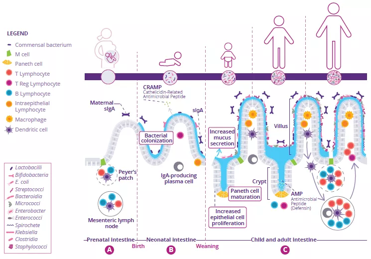Immunoglobulin A (IgA) are produced with varying affinity toward members of the microbiota as well as specific food antigens ingested by the neonate. Secreted IgA act to cross-link these targets in the intestinal lumen and limit their ability to adhere to and/or penetrate the gut epithelium (Fig 1B).2 Correspondingly, during weaning, the neonatal gut microbiota becomes increasingly diverse and concentrated in response to a changing diet and development of crypt-villous architecture. This requires further protection of the epithelial barrier through maturation of local lymphoid structures. Activated Paneth cells begin to produce host defense proteins (defensins) at the base of small intestinal crypts, allowing other epithelial cells to transition away from producing AMP at baseline. Lastly, proliferation of epithelial cells increases alongside the increased secretion of mucus (Fig 1C).