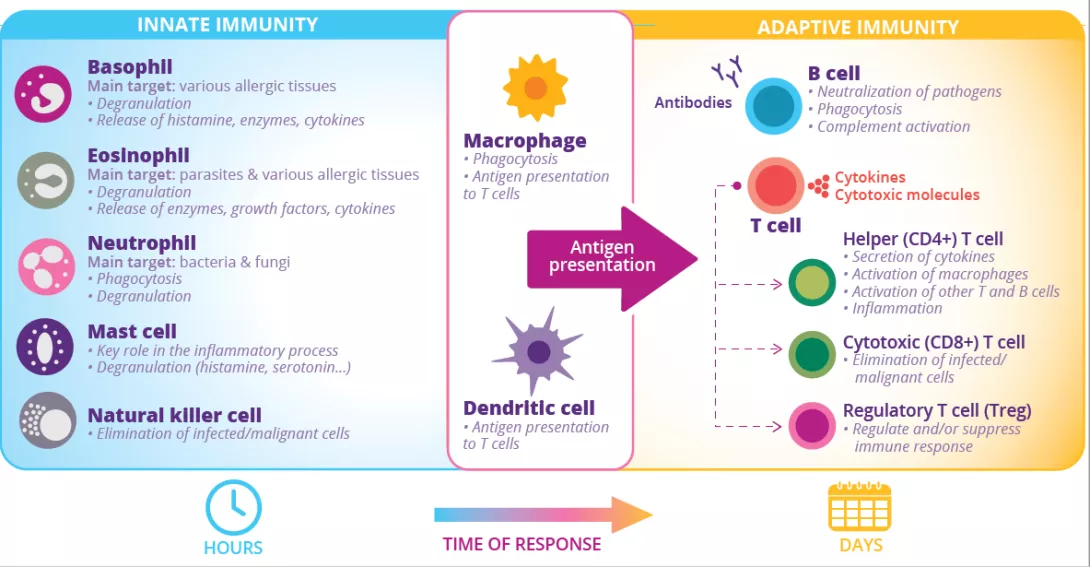 FIGURE 2: Innate and adaptive immune cells and functions.