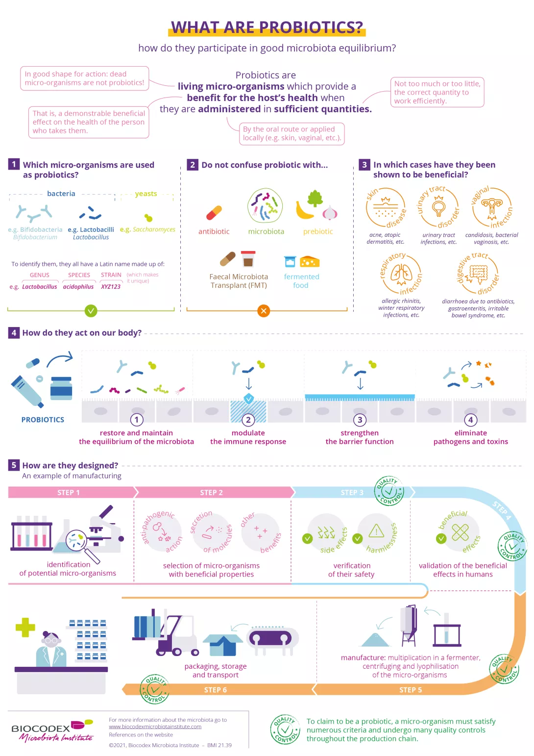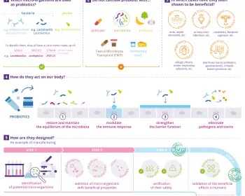 This infographic explains what are probiotics and how they help maintain a balanced microbiota, supporting overall health. It explores the types of beneficial microorganisms and the rigorous processes behind their production to ensure their effectiveness in promoting well-being.