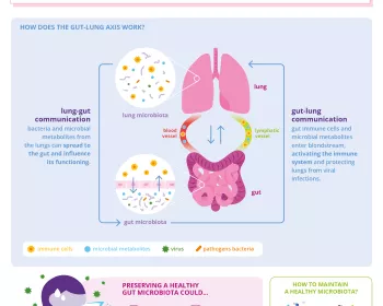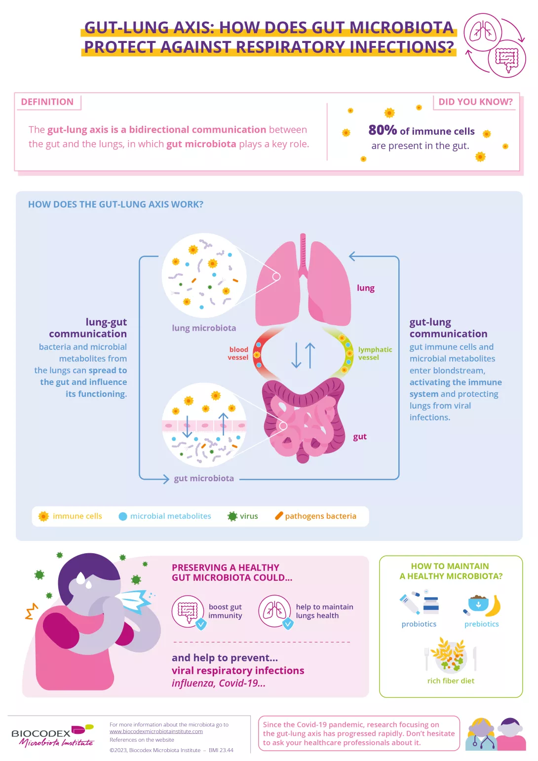 This infographic illustrates the gut-lung axis, detailing how gut microbiota modulates immune responses to safeguard against respiratory infections. It highlights the bidirectional communication between the gut and lungs.