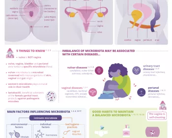 This infographic outlines 5 important things to know about the vaginal microbiota, including how it protects against infections and how hormonal changes affect its composition.