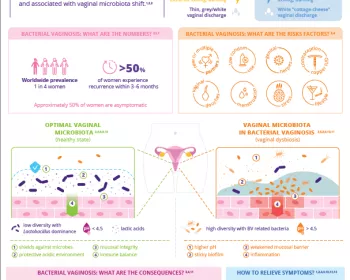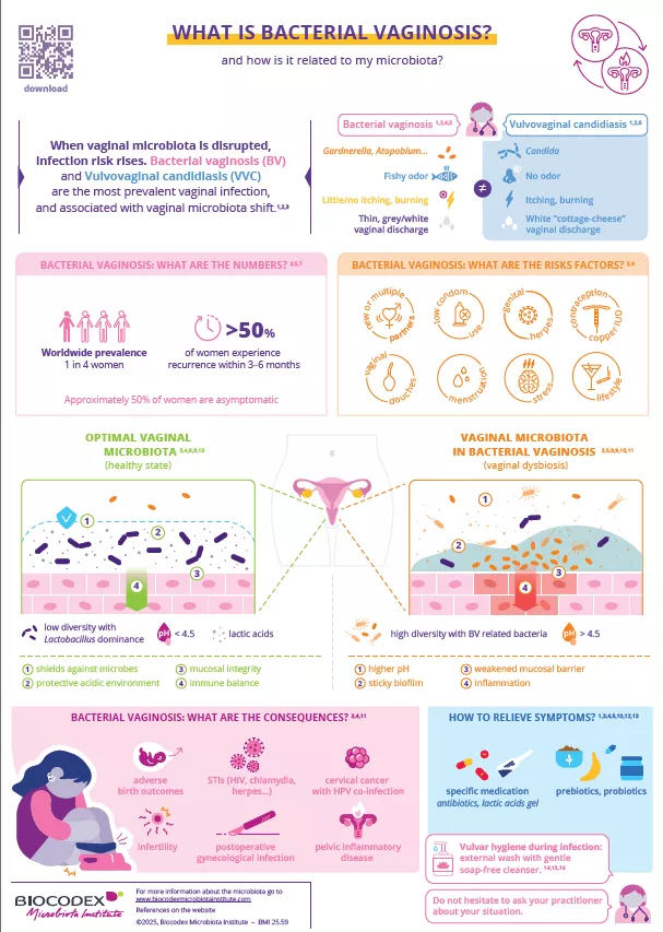 This infographic explains what bacterial vaginosis is, how it differs from vulvovaginal candidiasis, its main risk factors and potential consequences, and how symptoms can be relieved. Understanding the role of the vaginal microbiota is key to better prevention and care.