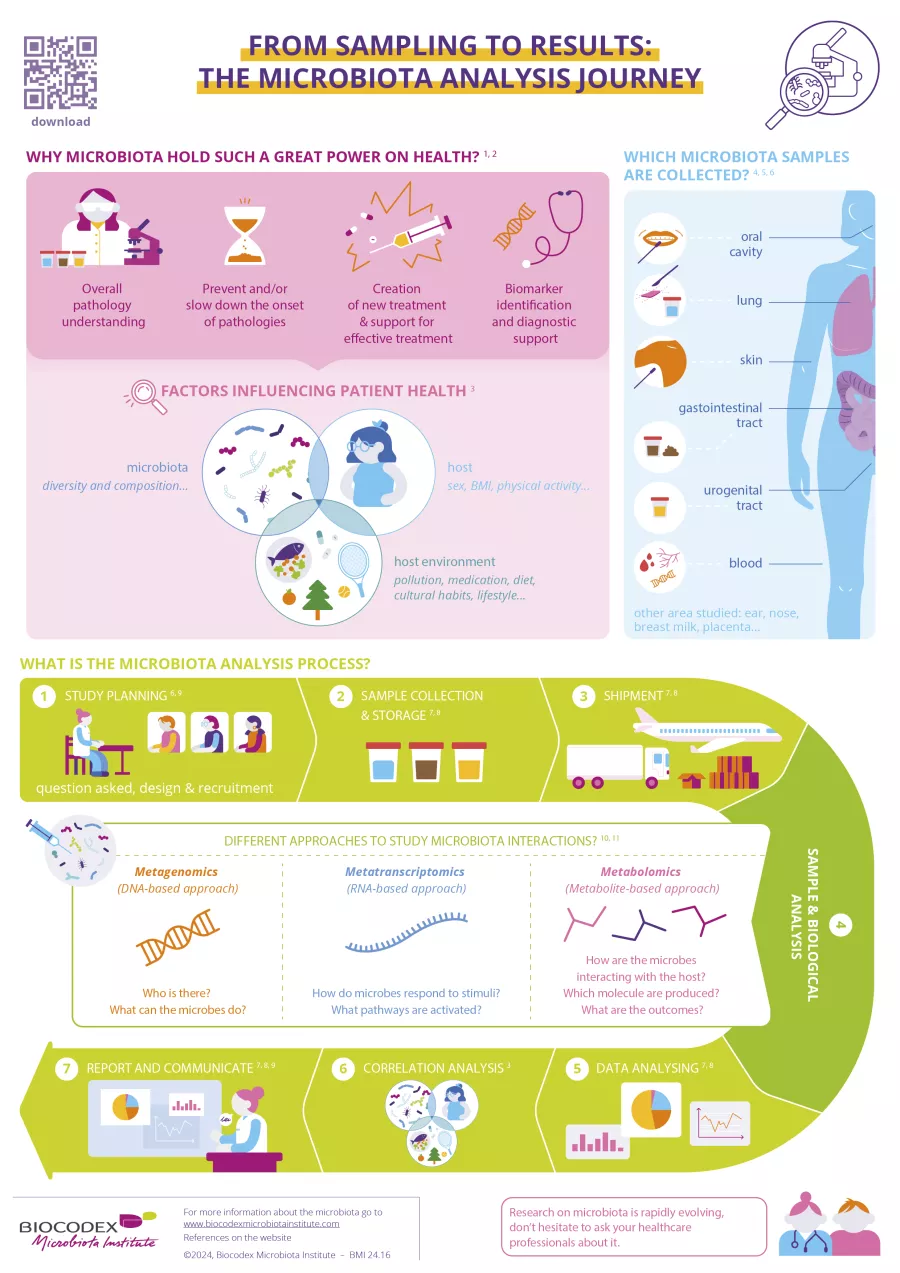 This infographic can be a first step in answering them. It outlines the key steps of microbiota analysis, from sample collection to final insights. Simplify complex processes and explore how microbiota data can impact health and personalized care.