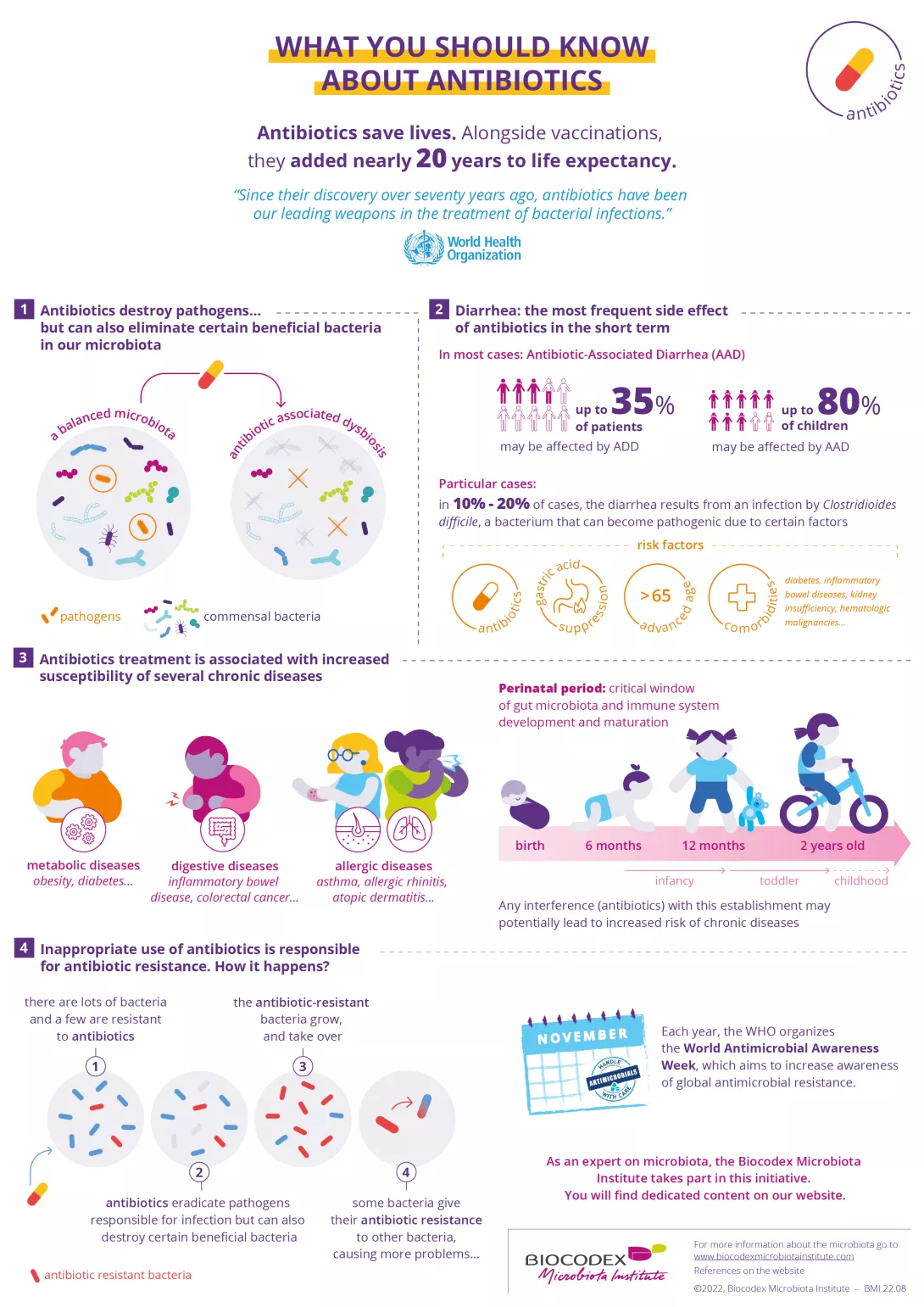 This infographic covers key facts about antibiotics, explaining how they help fight infections while also affecting the balance of beneficial bacteria in the microbiota.
