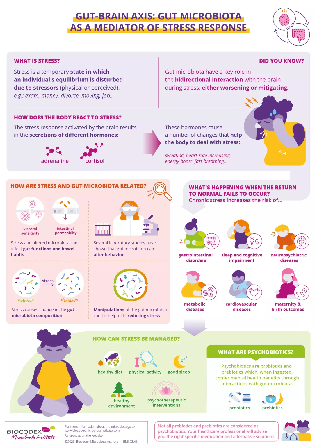 This infographic explores the connection between gut microbiota and stress, highlighting how the gut-brain axis influences both mental and physical well-being.