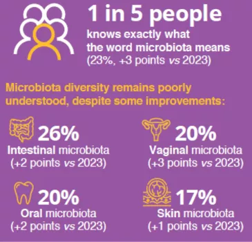 - Knowledge of the diversity of microbiotas remains limited but has also improved compared to last year. The gut microbiota remains the best-known microbiota: 26% know exactly what it is (+2 points vs. 2023). Next come vaginal microbiota (20%, +3 points vs. 2023), oral microbiota (20%, +2 points vs. 2023), skin microbiota (17%; +1 point vs. 2023), and urinary microbiota (16%, +2 points vs. 2023).