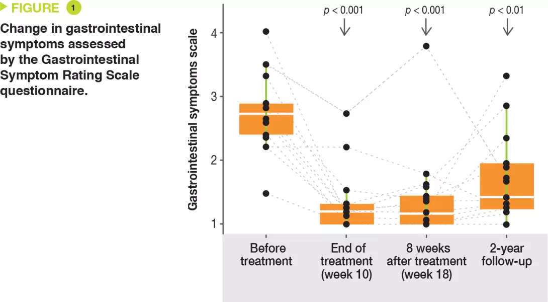 This article presents a follow-up evaluation of the 18 autistic children two years after the initial microbiota transfer therapy. Improvements in gastrointestinal symptoms, as assessed by the Gastrointestinal Symptom Rating Scale questionnaire, were maintained with a 58% reduction (Figure 1). Improvements were observed in all gastrointestinal symptoms (abdominal pain, indigestion, diarrhea, and constipation). Transit remained improved, with a 26% reduction in the percentage of days of abnormal stools.