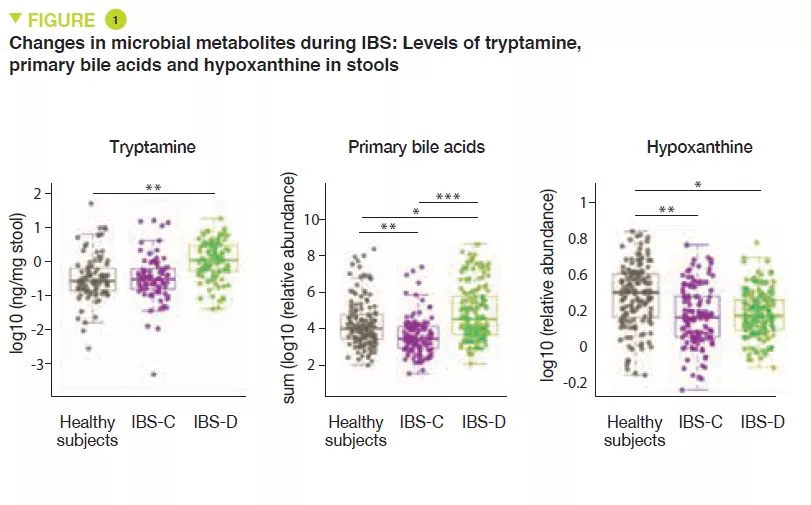 Metabolomic analysis of the stools revealed increased levels of tryptamine, a tryptophan metabolite produced by certain intestinal bacteria, in patients with IBS-D (Figure 1). Because tryptamine accelerates transit due to an action on the serotonin receptor, 5-HT4, it is suggested that it could have a role in the phenotype of these patients. Similarly, the proportion of primary bile acids was higher in patients with IBS-D, a sign of impaired transformation of bile acids by the microbiota. In vitro experiments suggest that primary bile acids increase secretion in the colon and could also participate in the phenotype.