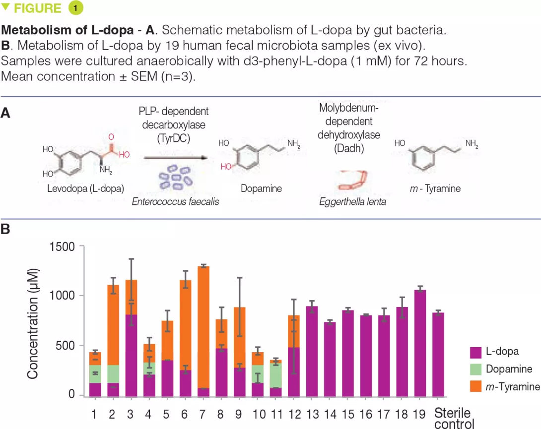 The human gut microbiota metabolizes the Parkinson’s disease medication Levodopa (L-dopa), potentially reducing drug availability and causing side effects. However, the organisms, genes, and enzymes responsible for this activity in patients and their susceptibility to inhibition by host-targeted drugs are unknown. Here, the authors describe an interspecies pathway for gut bacterial L-dopa metabolism. Conversion of L-dopa to dopamine by a pyridoxal phosphate-dependent tyrosine decarboxylase from Enterococcus faecalis is followed by transformation of dopamine to m-tyramine by a molybdenum-dependent dehydroxylase from Eggerthella lenta. These enzymes predict drug metabolism in complex human gut microbiotas. Although a drug that targets host aromatic amino acid decarboxylase does not prevent gut microbial L-dopa decarboxylation, the authors identified a compound that inhibits this activity in Parkinson’s patients microbiotas and increases L-dopa bioavailability in mice[1].